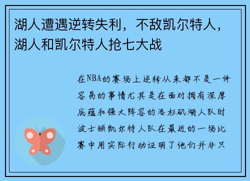 在NBA的赛场上,逆转从来都不是一件容易的事情,尤其是在面对拥有深厚底蕴和强大阵容的洛杉矶湖人队时。波士顿凯尔特人队在最近的一场比赛中,用实际行动证明了他们并非只是舆论中的“鱼腩部队”。在这场备受瞩目...