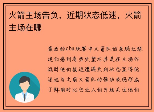 最近的cba联赛中,火箭队的表现让球迷们感到有些失望。尤其是在主场作战时,他们接连遭遇失利,状态显得低迷。这与之前火箭队的强劲表现形成了鲜明对比,也让人们开始关注他们到底出了什么问题。 火箭队近期的低...