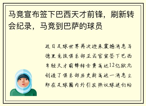 近日,足球世界再次迎来震撼消息!马德里竞技俱乐部正式官宣签下巴西年轻天才前锋,转会费高达1.2亿欧元,创造了俱乐部历史新高!这一消息立即在足球圈内外引发热议,球迷们纷纷感叹:“马竞这是要冲击冠军的节奏...