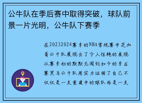 • 公牛队在季后赛中取得突破,球队前景一片光明,公牛队下赛季