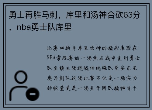 • 勇士再胜马刺,库里和汤神合砍63分,nba勇士队库里