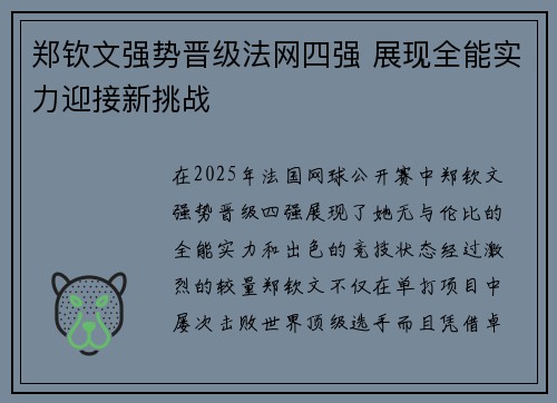 在2025年法国网球公开赛中,郑钦文强势晋级四强,展现了她无与伦比的全能实力和出色的竞技状态。经过激烈的较量,郑钦文不仅在单打项目中屡次击败世界顶级选手,而且凭借卓越的技术、心态和战术调整能力,成功跨...