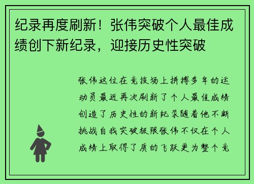 张伟,这位在竞技场上拼搏多年的运动员,最近再次刷新了个人最佳成绩,创造了历史性的新纪录。随着他不断挑战自我,突破极限,张伟不仅在个人成绩上取得了质的飞跃,更为整个竞技领域注入了新的活力和激情。在这次突...