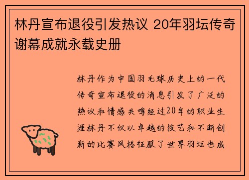 林丹,作为中国羽毛球历史上的一代传奇,宣布退役的消息引发了广泛的热议和情感共鸣。经过20年的职业生涯,林丹不仅以卓越的技艺和不断创新的比赛风格征服了世界羽坛,也成为了无数羽毛球爱好者心中的偶像。在宣布...