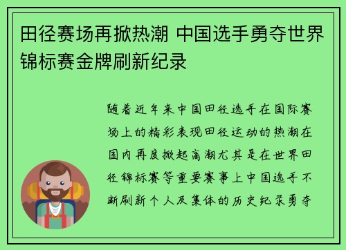 随着近年来中国田径选手在国际赛场上的精彩表现,田径运动的热潮在国内再度掀起高潮,尤其是在世界田径锦标赛等重要赛事上,中国选手不断刷新个人及集体的历史纪录,勇夺金牌。这不仅彰显了中国体育的强大实力,也为...