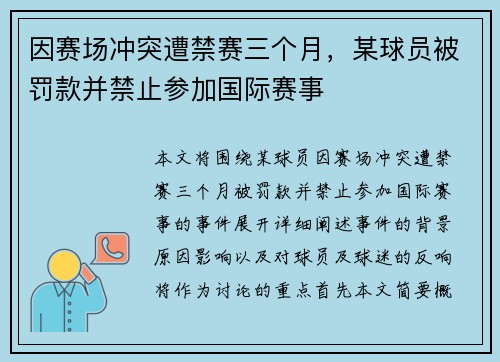 本文将围绕某球员因赛场冲突遭禁赛三个月、被罚款并禁止参加国际赛事的事件展开详细阐述。事件的背景、原因、影响以及对球员及球迷的反响将作为讨论的重点。首先,本文简要概述此事件的发生、其具体处罚以及所引发的...