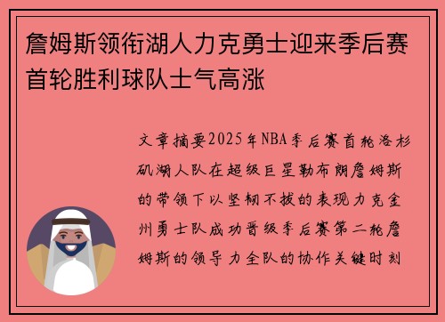文章摘要:2025年NBA季后赛首轮,洛杉矶湖人队在超级巨星勒布朗·詹姆斯的带领下,以坚韧不拔的表现力克金州勇士队,成功晋级季后赛第二轮。詹姆斯的领导力、全队的协作、关键时刻的决胜表现以及球队士气的高...