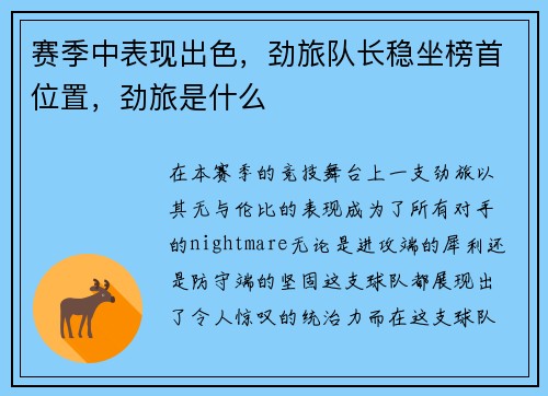 在本赛季的竞技舞台上,一支劲旅以其无与伦比的表现成为了所有对手的nightmare。无论是进攻端的犀利,还是防守端的坚固,这支球队都展现出了令人惊叹的统治力。而在这支球队中,队长无疑是最耀眼的明星。他...