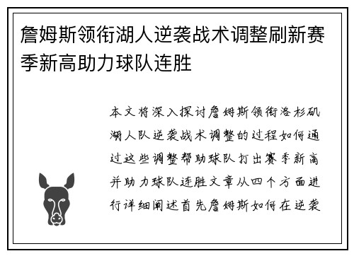 本文将深入探讨詹姆斯领衔洛杉矶湖人队逆袭战术调整的过程,如何通过这些调整帮助球队打出赛季新高,并助力球队连胜。文章从四个方面进行详细阐述:首先,詹姆斯如何在逆袭过程中发挥核心作用;其次,湖人队在战术调...