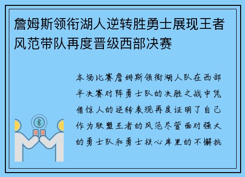 本场比赛,詹姆斯领衔湖人队在西部半决赛对阵勇士队的决胜之战中,凭借惊人的逆转表现,再度证明了自己作为联盟王者的风范。尽管面对强大的勇士队和勇士核心库里的不懈抗争,湖人在詹姆斯的引领下实现了惊天逆袭,成...
