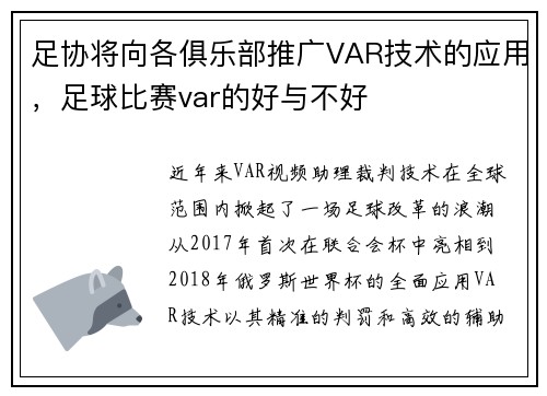 近年来,VAR(视频助理裁判)技术在全球范围内掀起了一场足球改革的浪潮。从2017年首次在联合会杯中亮相,到2018年俄罗斯世界杯的全面应用,VAR技术以其精准的判罚和高效的辅助功能,赢得了国际足坛的...